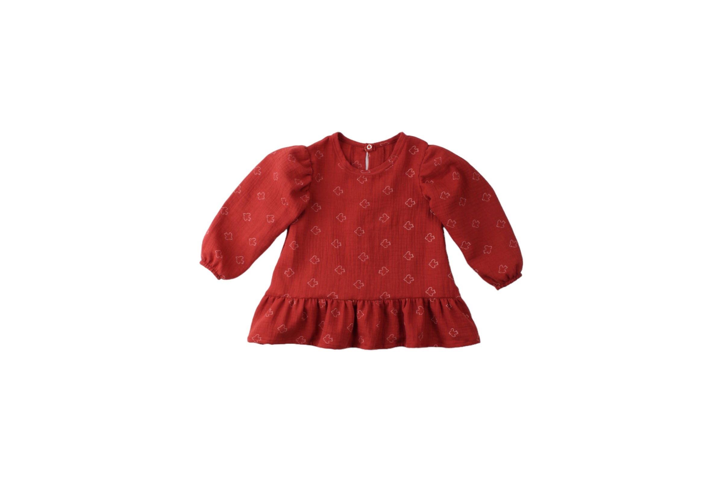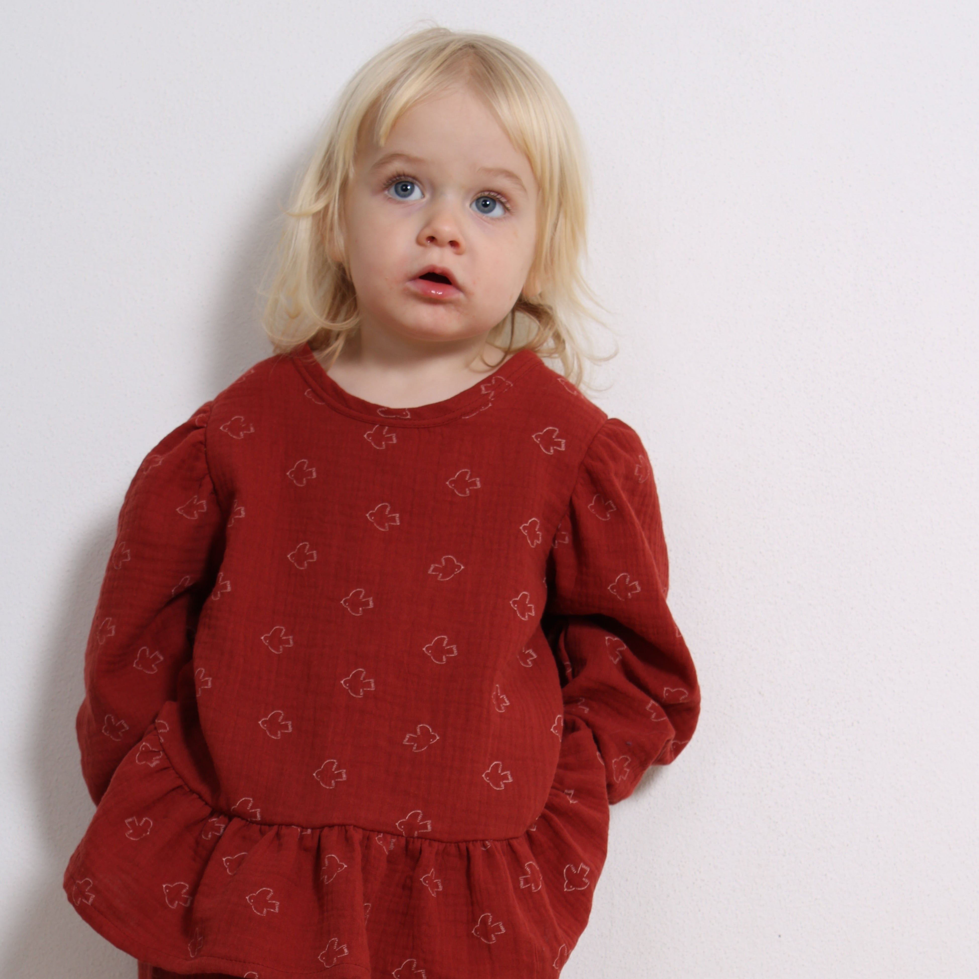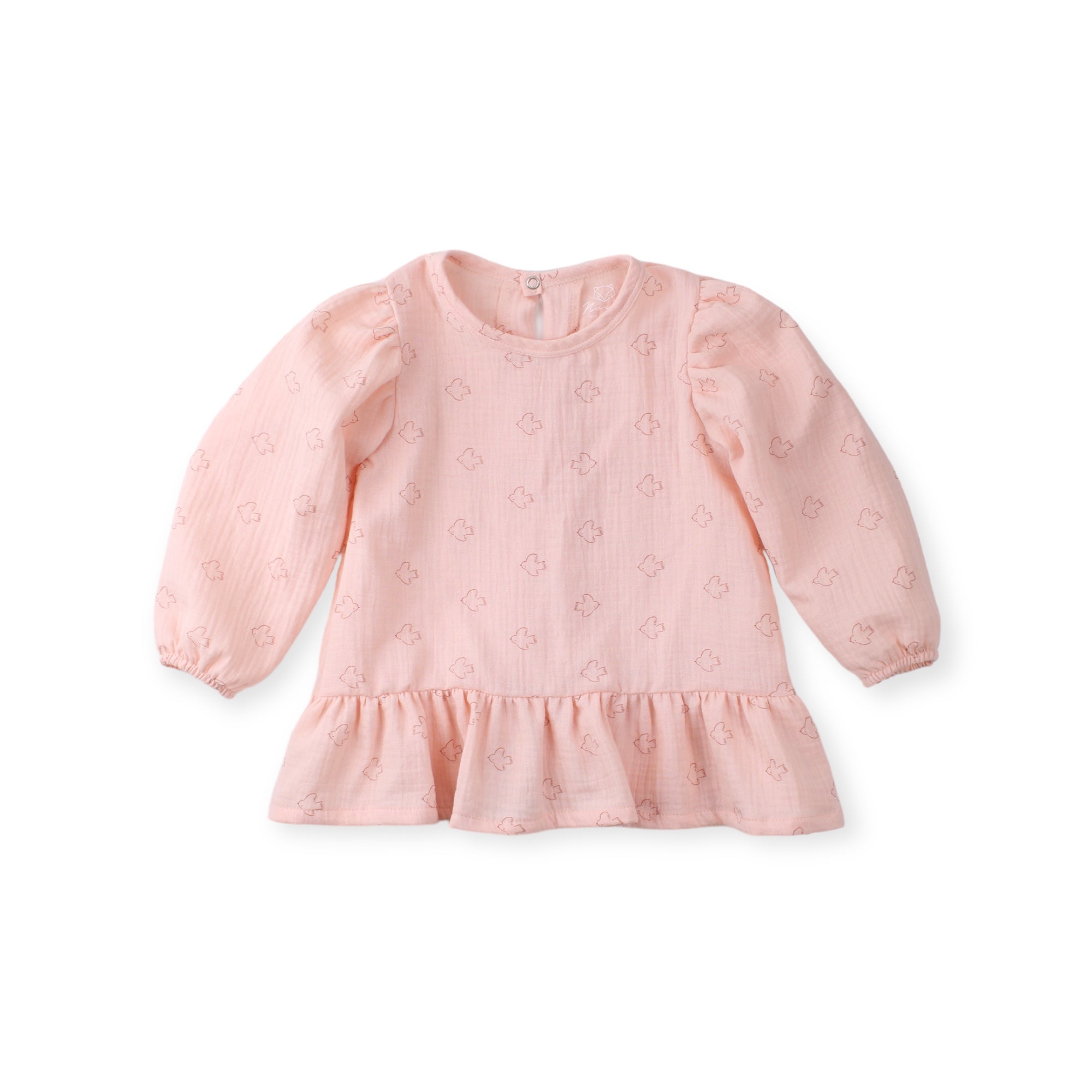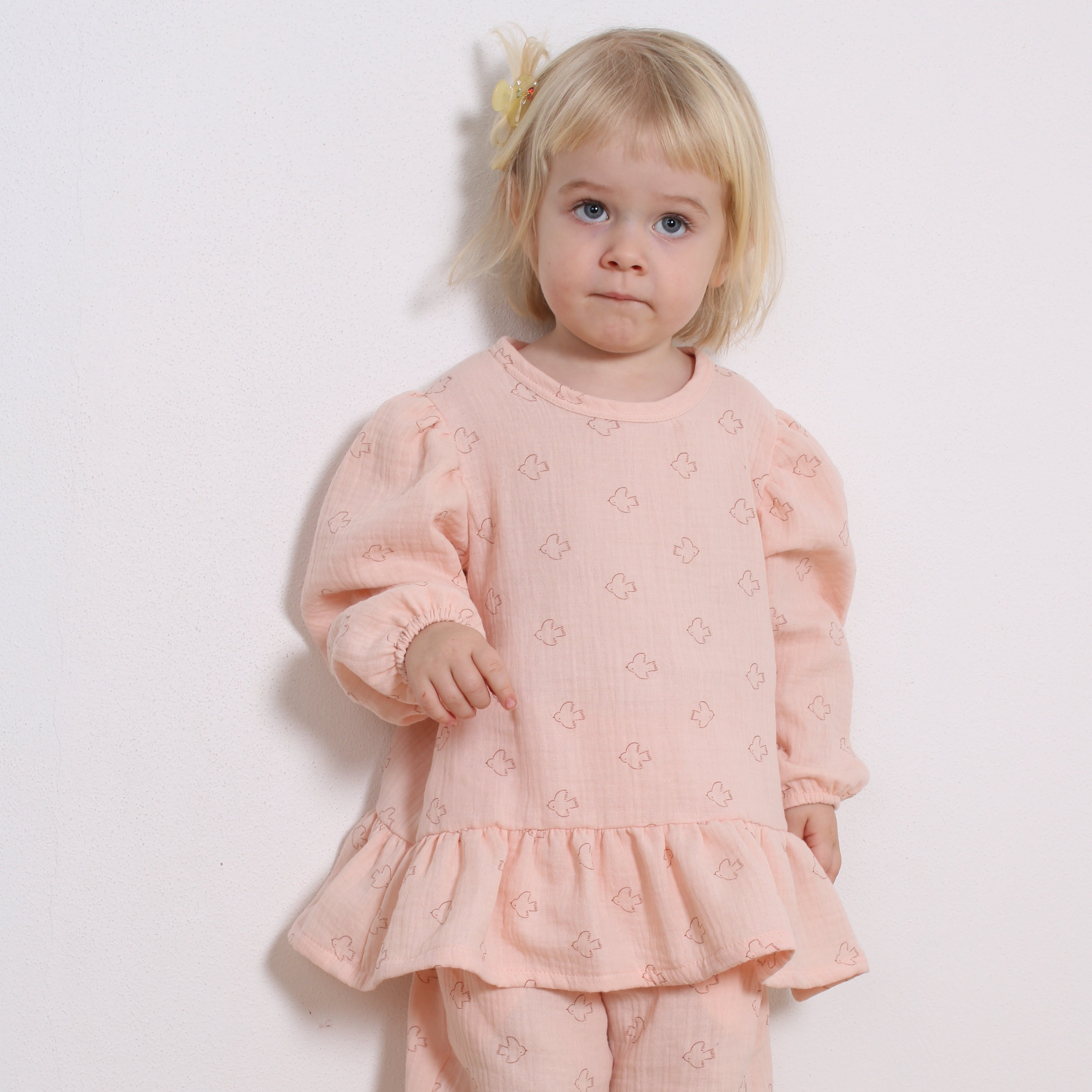 Sød og blød bluse i den lækreste muslin med fine fugle motiver. Blusen er i a-facon med pufærmer og flæse. Match med bukserne i samme fine print. Fås også som Mini & Me Match.