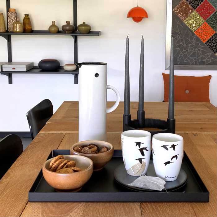 Brug bakken til servering eller til opbevaring af køkkengrej, og skab smukke stilleben med vaser, lysestager og små skåle. I hjemmet kan bakken samle de ting, man ikke lige ved, hvor skal placeres – og netop dét skaber ro i indretningen. Den fungerer også perfekt på kontoret til magasiner, notesblokke og småting.
