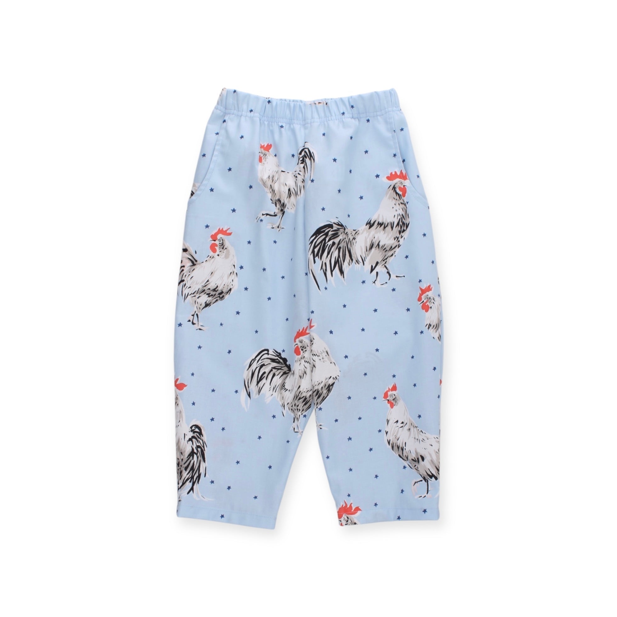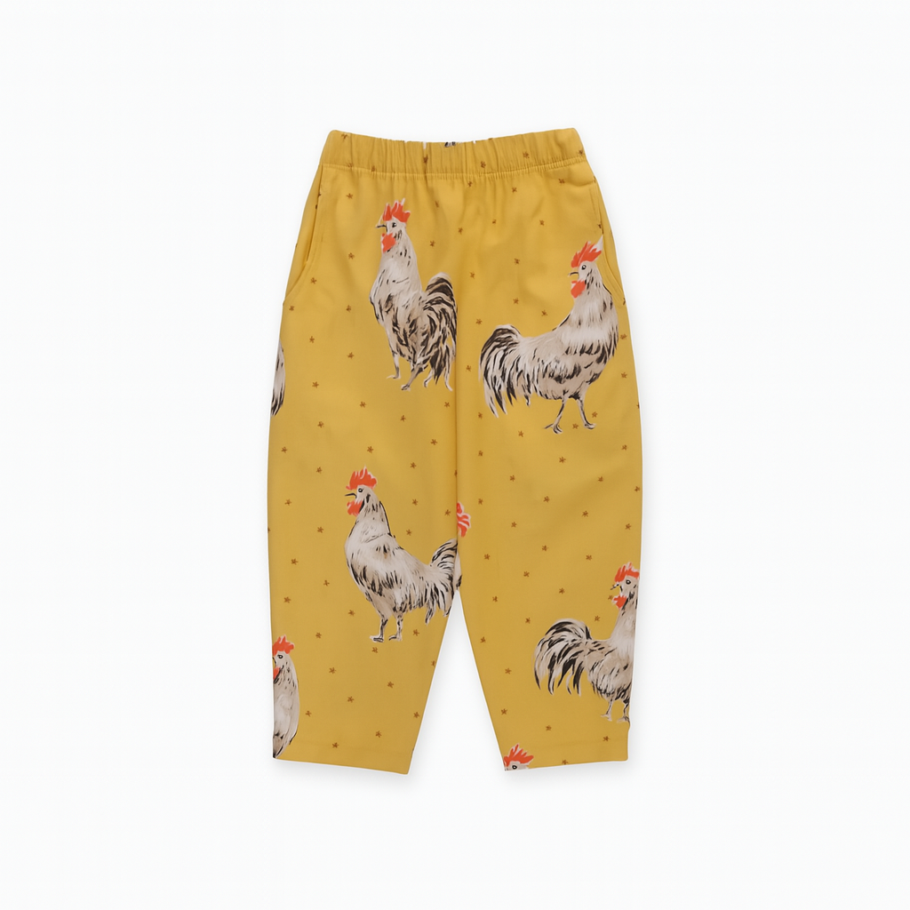 Cool unisex bukser med lommer i et fint print med haner. Match med skjorten i samme fine print. Printet Fås også som Mini & Me Match. Obs placeringen af hanerne kan variere fra størrelse til størrelse.