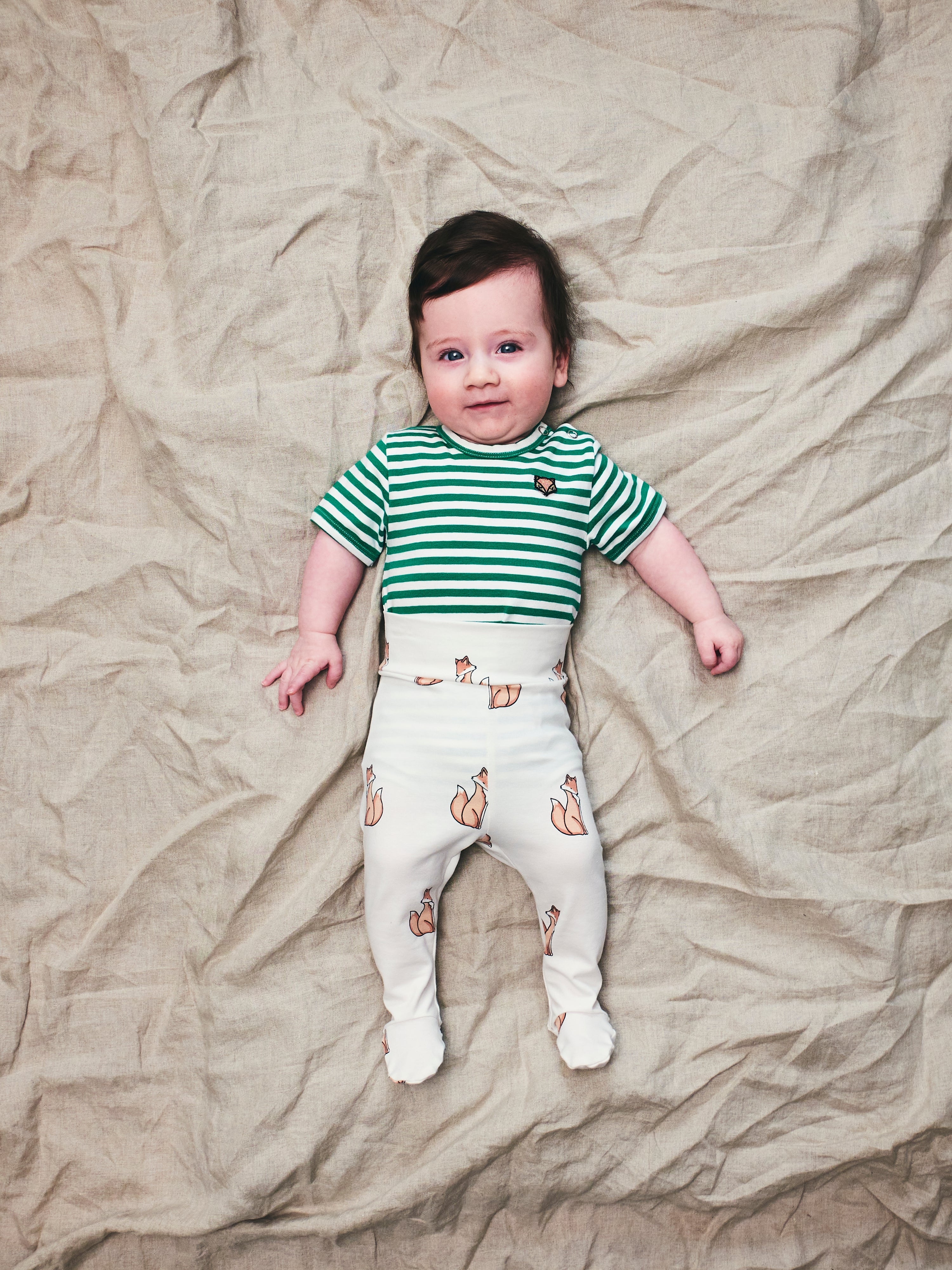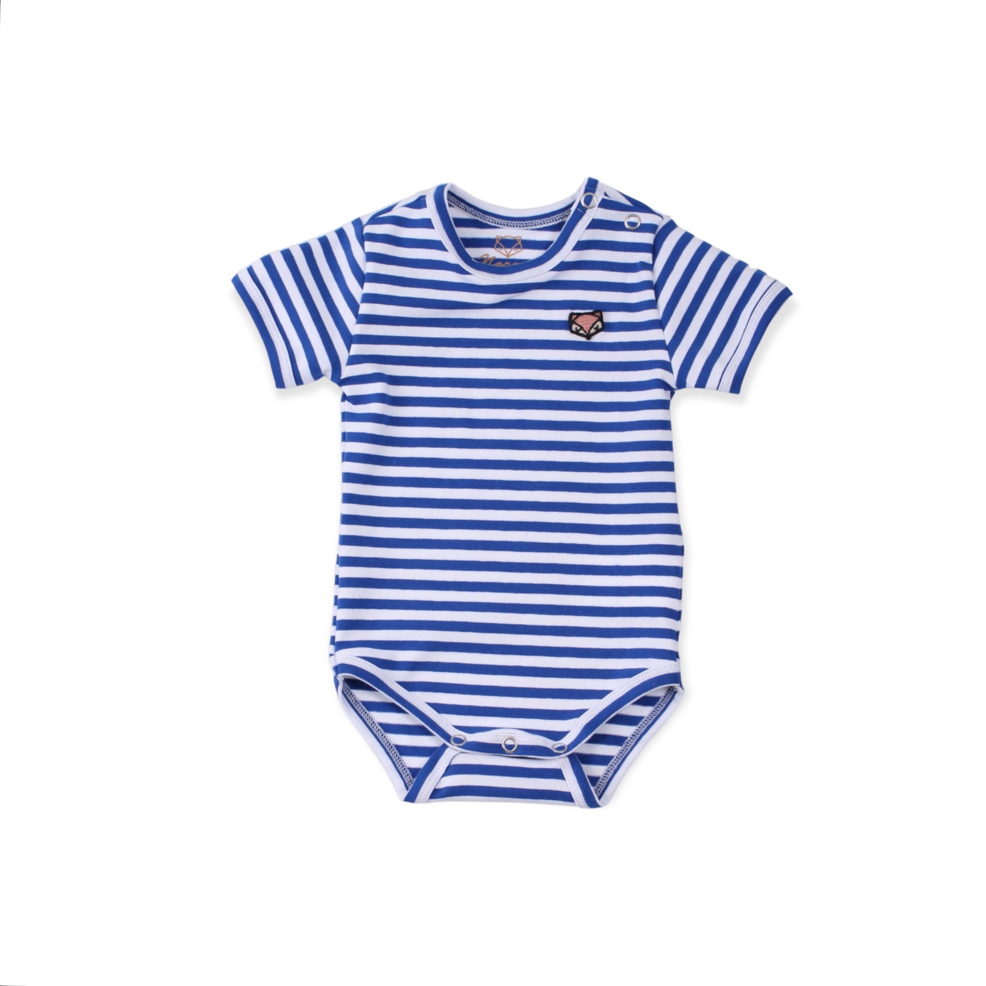 Kortærmet unisex body med lækre striber og ræve-badge på brystet. Bodyén er i en lækker blød øko-tex certificeret bomuld med elastan, så den gode pasform bevares.
