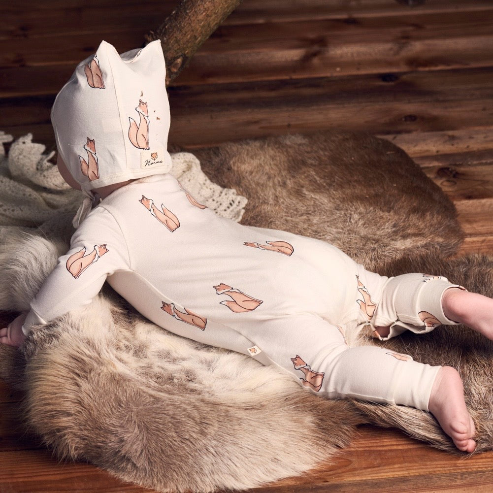 Unisex babyhue i ræve-print, der luner godt om de små babyers ører. Huen har praktiske trykknapper med mulighed for justering. Passer ca str. 0-6 mdr.
