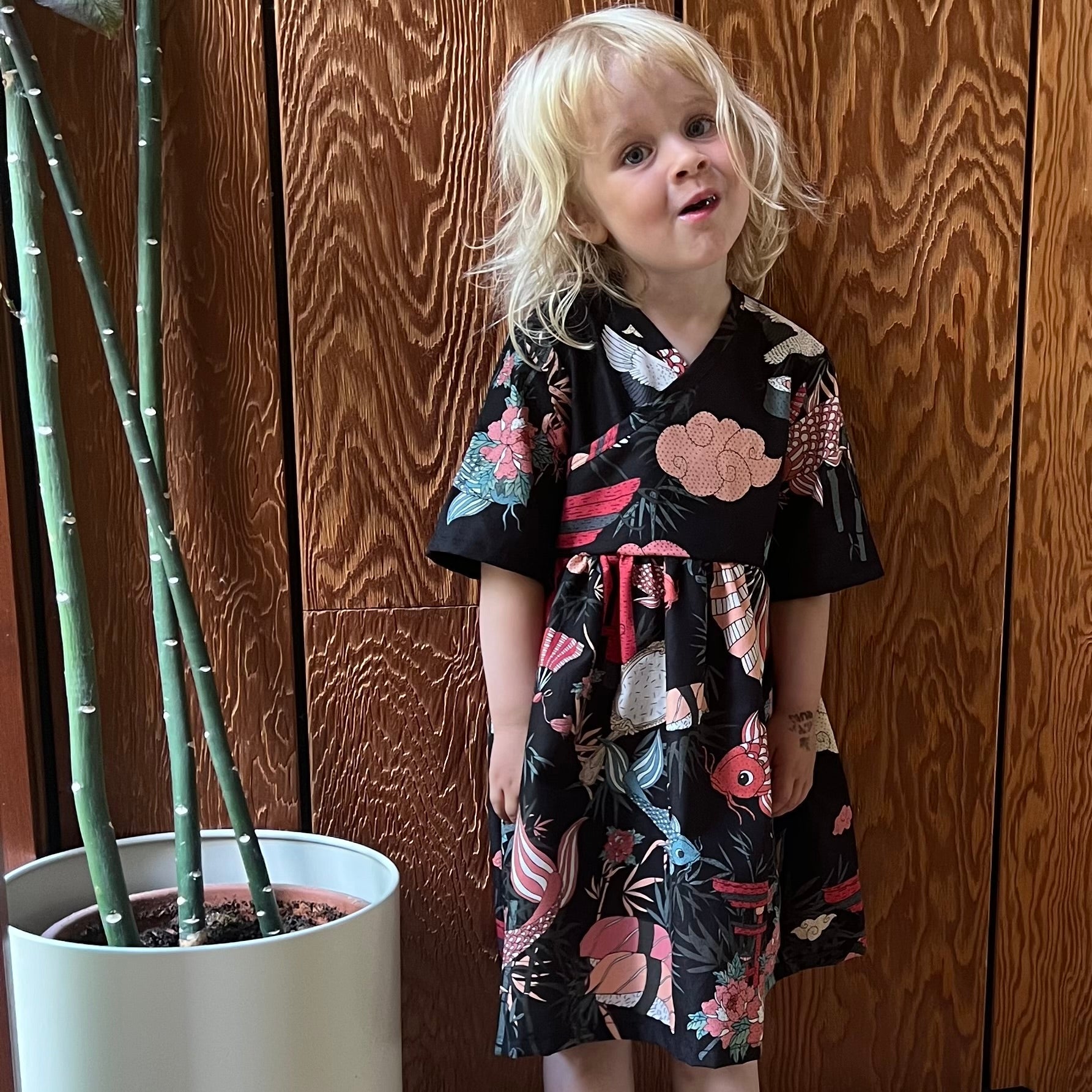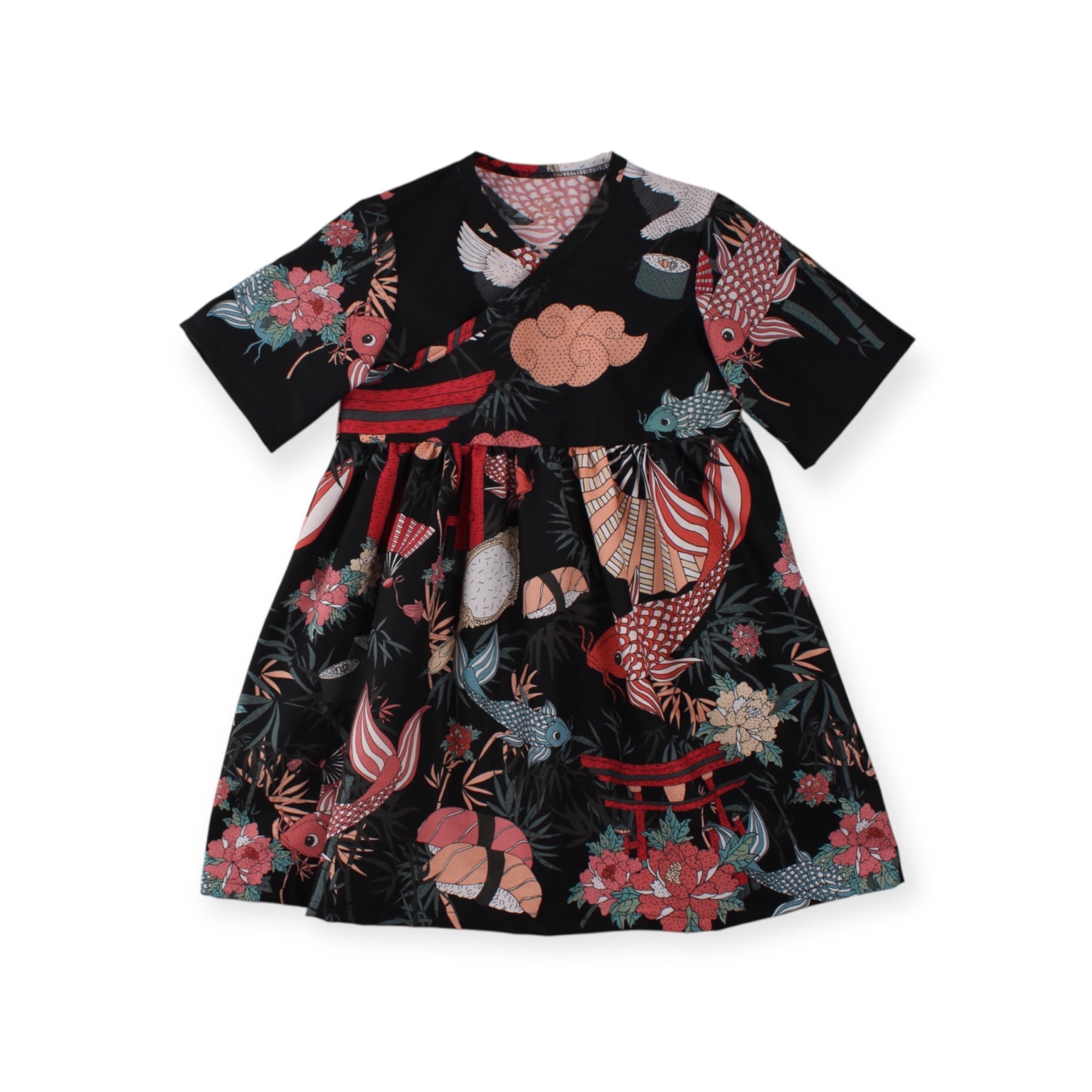 Sød kjole med slå-om look i det smukkeste Tokyo print. Brug den med bare ben eller med ensfarvet leggings under eller vores populære striber.
