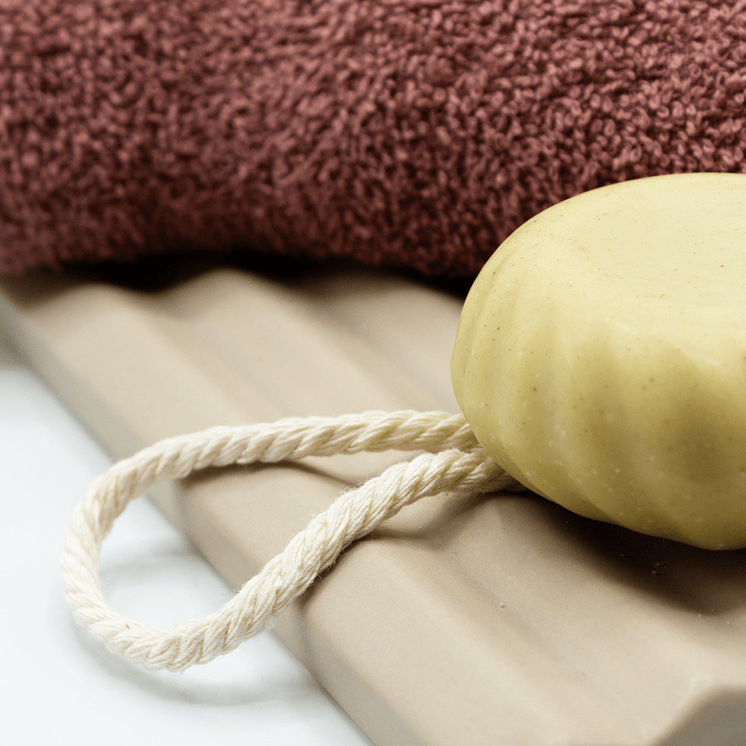 Kropssæben med sin runde form og snor er både behagelig og nem at anvende i badet. Sæben indeholder Chassoul-ler, som gør den let eksfolierende og rensende. Den faste kropssæbe har et højt indhold af olivenolie og sheasmør, der plejer og nærer huden. Sæben har en mild duft af Lemongrass.