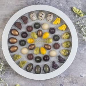 er en eksklusiv og generøs påskegave med 42 fyldte chokolader samlet i en stor, smuk rund gaveæske.