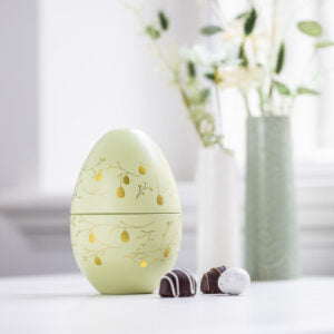 er et smukt grønt metalæg fyldt med 12 lækre marcipan- og nougatæg – en klassisk og elegant påskegave.