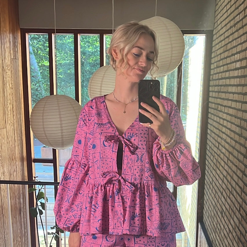 Cool bluse med bindebånd i et fint print i skønne farver og i en let lækker let bomulds kvalitet. Blusen har en løs pasform og rummelig i størrelsen. Match med bukser til. Printet fås som Mini & Me Match