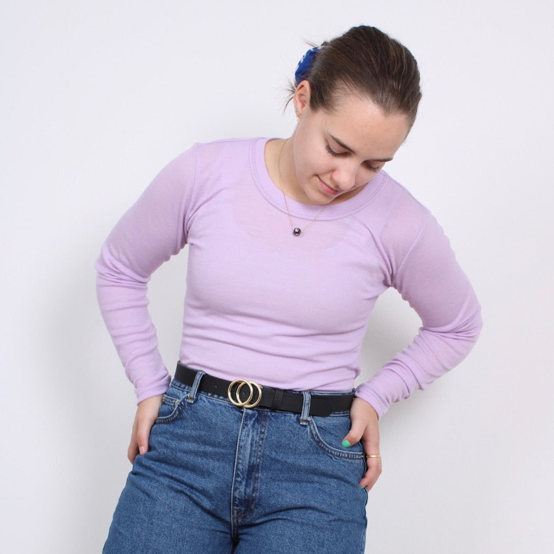 Lækreste langærmet rib bluse i 100% merinould i en smuk lilla farve. Blusen er meget strækbar. Must have håndsyet basis style i din garderobe - perfekt under kjoler eller alene med cool jeans til.