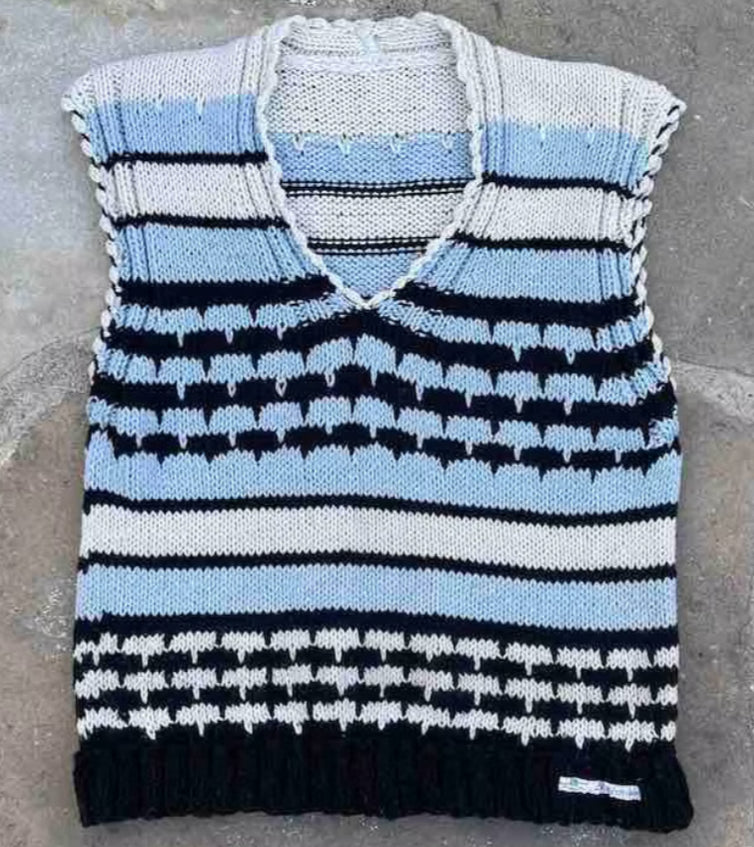 Lolland Strikker Mønstret Vest Blå/Hvid/Sort – Str. 36-40 - Danskproduceret