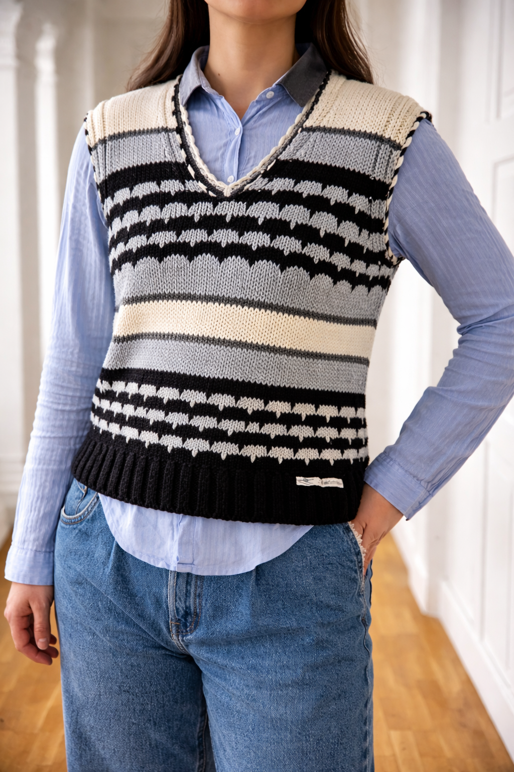 Denne mønstrede strikkede vest fra Lolland Strikker i blå, hvid og sort kombinerer klassisk nordisk design med feminin pasform. Vesten er let taljeret og har fine detaljer ved udskæring og ærmer, som giver et elegant og gennemført udtryk.