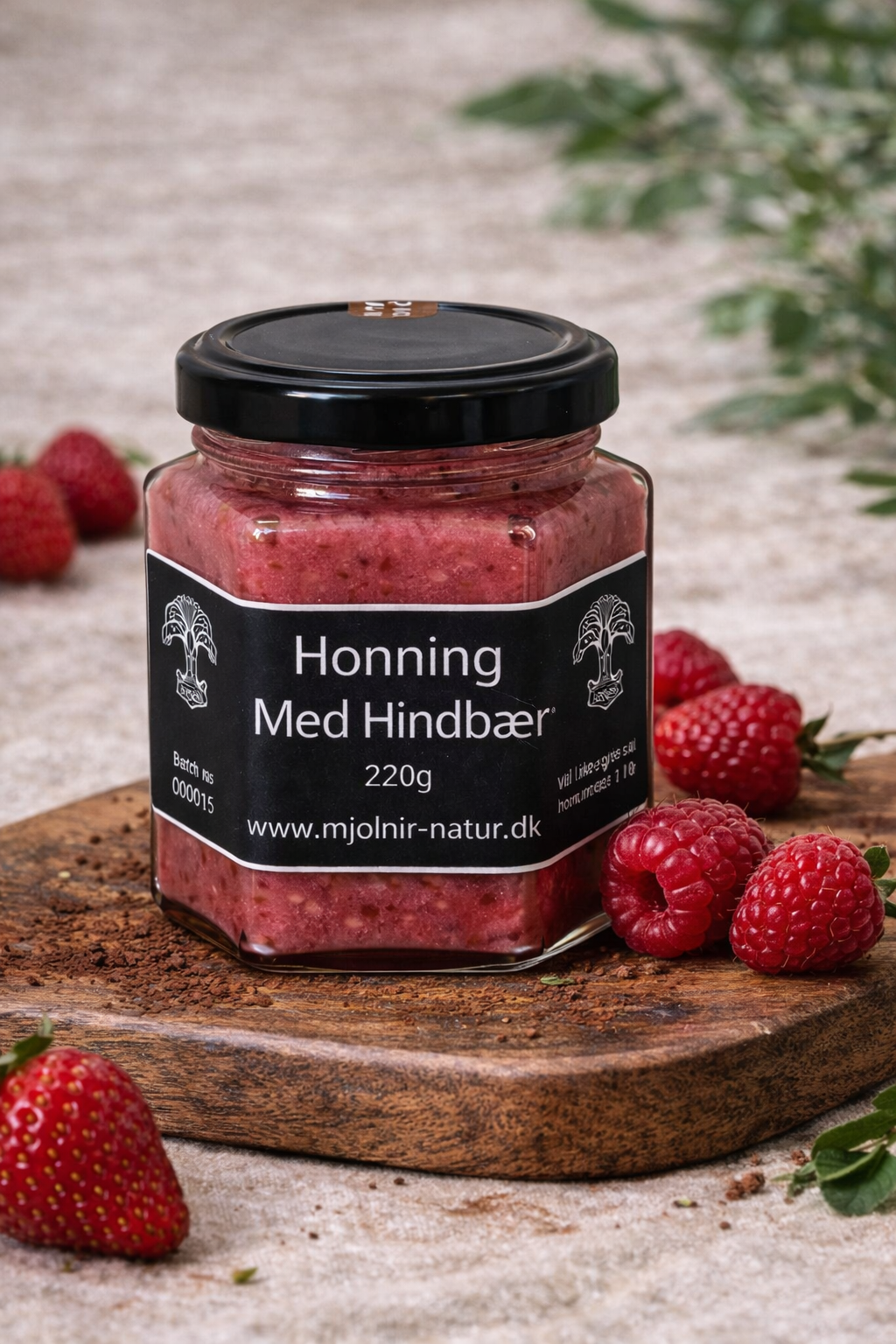 Mjólnír honning med hindbær er 100% dansk honning, nænsomt kombineret med hindbær for en frisk, let syrlig og frugtig smagsoplevelse. Den naturlige sødme fra honningen spiller smukt sammen med hindbærrets karakteristiske bærsyre og giver en velafbalanceret og aromatisk honning.