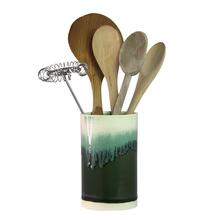 Køkkenredskabsholder til grydeskeer, piskeris, palette etc.\nKøkkenredsskabskrukken er konisk i bunden, så køkkenredskaberne står pænere.\nDa krukken til køkkenredskaber er håndlavet i keramik kan der være små variationer.\nKan gå i opvaskemaskine.\nPorcelæn.\nBredde: 9,5 cm.\nHøjde: 16 cm.