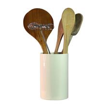 Køkkenredskabsholder til grydeskeer, piskeris, palette etc.\nKøkkenredsskabskrukken er konisk i bunden, så køkkenredskaberne står pænere.\nDa krukken til køkkenredskaber er håndlavet i keramik kan der være små variationer.\nKan gå i opvaskemaskine.\nPorcelæn.\nBredde: 9,5 cm.\nHøjde: 16 cm.