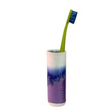 Tandbørstevase, tandbørstekrus, tandkrus, tandbørsteholder - kært barn har mange navne.\nSmuk og hygiejnisk tandbørsteholder i keramik. Slut med at dele bakterier og virus med resten af familien! Også ideel til makeup pensler eller den enlige blomst.\nSuppler evt. med en kop til tandpastaen.\nDa tandbørstevaserne er håndlavet kan der være små variationer.\nKan gå i opvaskemaskine.\nPorcelæn.\nBredde: 3,5 cm.\nHøjde: 10,5 cm.