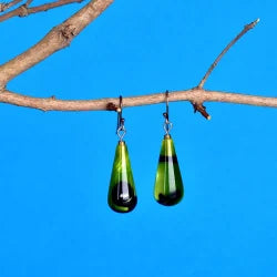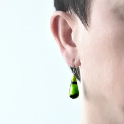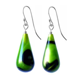 Disse dråbeformede øreringe er udført i højglanspoleret, hånddrejet akryl med en perlemorsagtig glans og et raffineret farvespil i grønlige nuancer med sorte accenter. Overfladen reflekterer lyset blødt og giver smykket et dynamisk, næsten organisk udtryk.