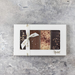 Minibar 4 fra Xocolatl indeholder fire rene chokoladebarer med forskellige smagsvarianter. Æsken kombinerer mørk chokolade, karamelchokolade og hvid chokolade i et mindre format.