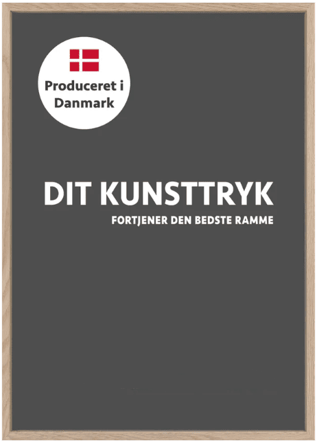 Danskproduceret ramme i massivt egetræ med refleksfrit og UV-beskyttende museumsglas. Elegant nordisk design, der fremhæver kunsttryk og beskytter farverne – perfekt til kunsttryk af Lone Reedtz.
