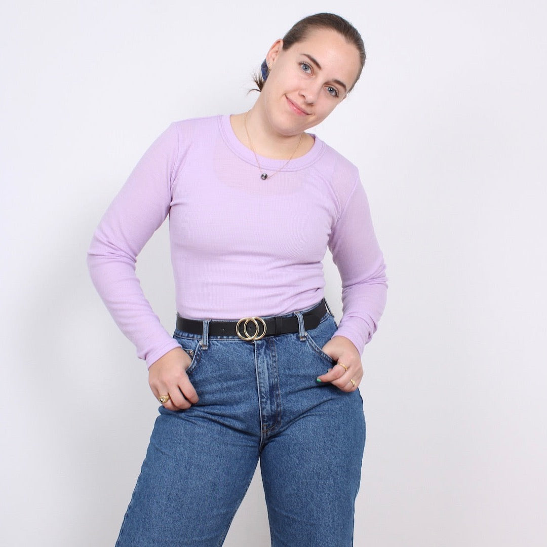 Lækreste langærmet rib bluse i 100% merinould i en smuk lilla farve. Blusen er meget strækbar. Must have håndsyet basis style i din garderobe – perfekt under kjoler eller alene med cool jeans til.