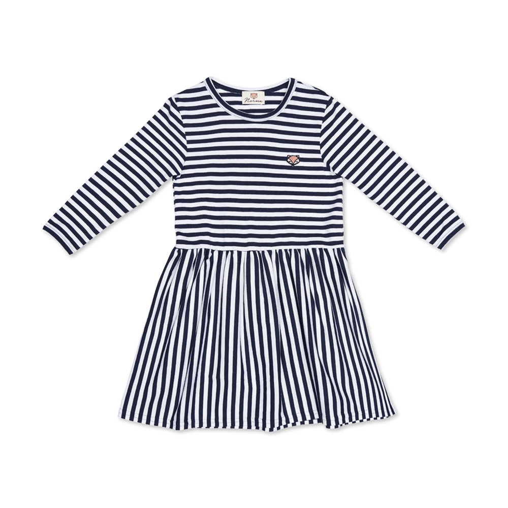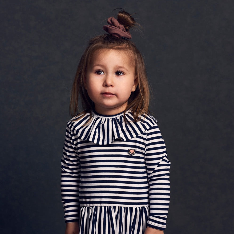 Basis kjole med flæse og lange ærmer i marineblå striber og med cool ræve-badge. Kjolen er i øko-tex certificeret viskose og elastan, så den gode pasform bevares. Laura kjolen er Normas bestseller
