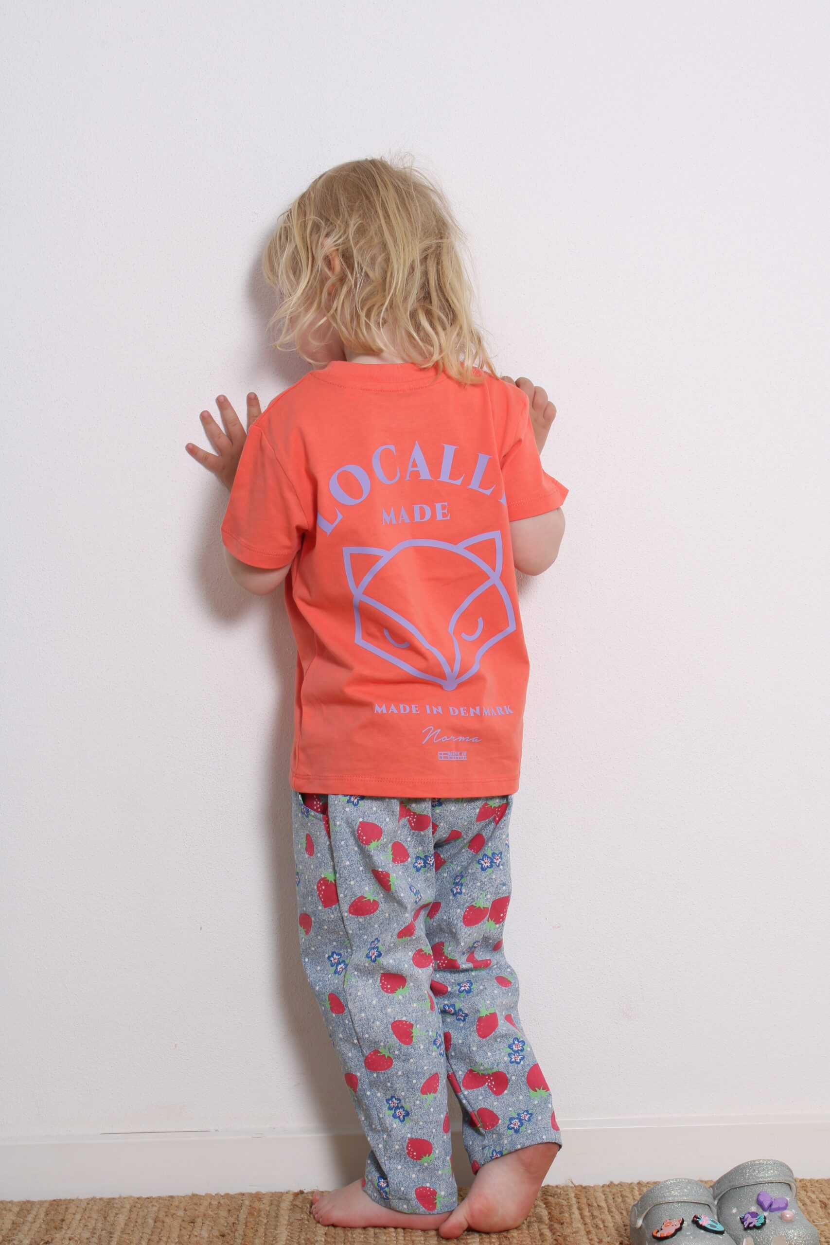 Cool søde ballonbukser med lommer i et fint jordbær og blomster print i skønne farver og i en let lækker bomulds kvalitet i denim look. Match med spencer til og en cool t-shirt